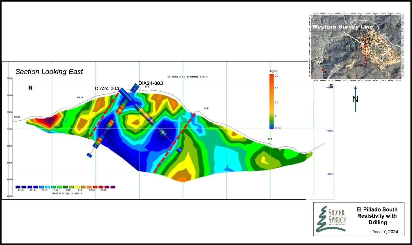 During 2024, Colibri and Silver Spruce completed 2 lines of electrical exploration (resistivity) located approximately 125 m southeast of the historical Pillado mine workings. Two holes were planned to test a domain characterized by sharp, moderately north dipping (apparent), resistivity gradients (see Figures 2, 3, 4 and 5). Both holes intersected significant lengths of anomalous mineralization, 22.5 m in hole DIA24-03 and 8.2 m in hole DIA24-04. Hole DIA24-03 included an intercept of 0.08 g/t Au, 94.80 g/t Ag, 2,89 % Pb, and 1.12 % Zn.