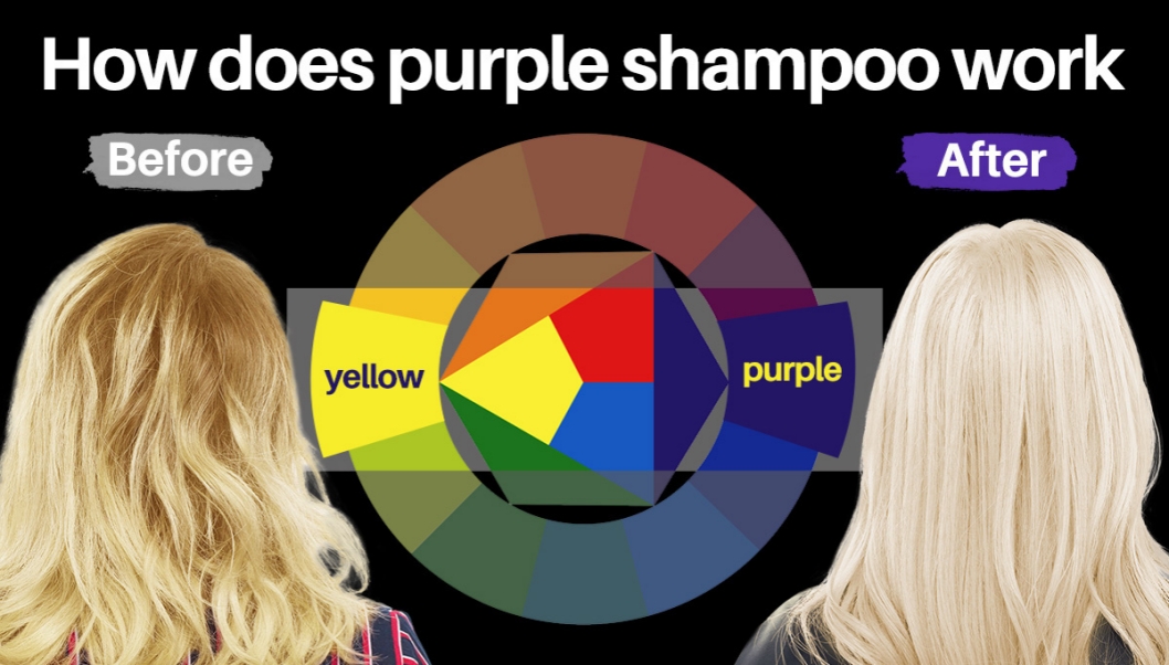 Brassiness refers to the yellow tones that can develop in blonde hair due to daily activities like sun exposure, hard water, or fading color treatments. Purple shampoo works through the principles of color wheel theory. We can use a cool color against a warm color to get a color that doesn't interfere with the target color. And we can see the that purple pigments in the shampoo are directly opposite yellow, which would help to get rid of the yellow brassiness.