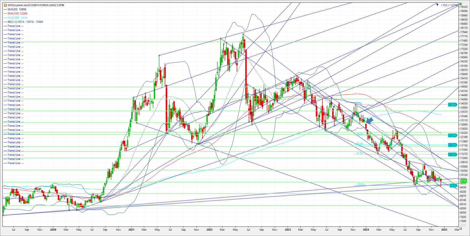 Soybeans were pressured on three straight days of producer selling to begin the week but recovered on Thursday/Friday amid profit taking as the theme in my opinion. The late week rebound was encouraging, particularly when viewed in light of strong daily and weekly export news. But the ability of soybeans and products to sustain rallies is open to serious question. Does the late week rally get rewarded with selling? Earlier in the week pressure from the looming Brazilian harvest likely exacerbated the soybean market’s reaction to the Fed’s more hawkish tone and the resulting U.S. dollar surge and equity market breakdown. The enormous Brazilian crop will soon become a reality, as will the potential of President Trump’s trade policies. In my view strong production headlines continue to come out of Brazil with private estimates now feeling pretty confident about a 170 MMT+ soybean crop. Argentina has more weather risk as it is earlier in the growing season and forecasts are appearing to show some dryness over the next 15 days. It is too early to draw too much concern on crop size, but the Argentina forecast may begin getting more attention if the dryness persists. Todays close just below 9.80 March beans is nestled just below a key trendline. (see chart). Consecutive closes over 9.80 push the market to 10.02 which is the 21-week moving average. Above that its 10.08, the next key trendline resistance. We close above these levels, don’t be short, the bean market could run to 10.47/49. Support is 971. A close under and its 9.54 and then 9.41. A close under 9.41 and its katy bar the door to 9.02. Keep in mind we are in holiday markets mode until the first full week of January. No trade recs as of right now as the stalemate of the US debt ceiling and potential government shutdown look as there is no deal as of this post.
