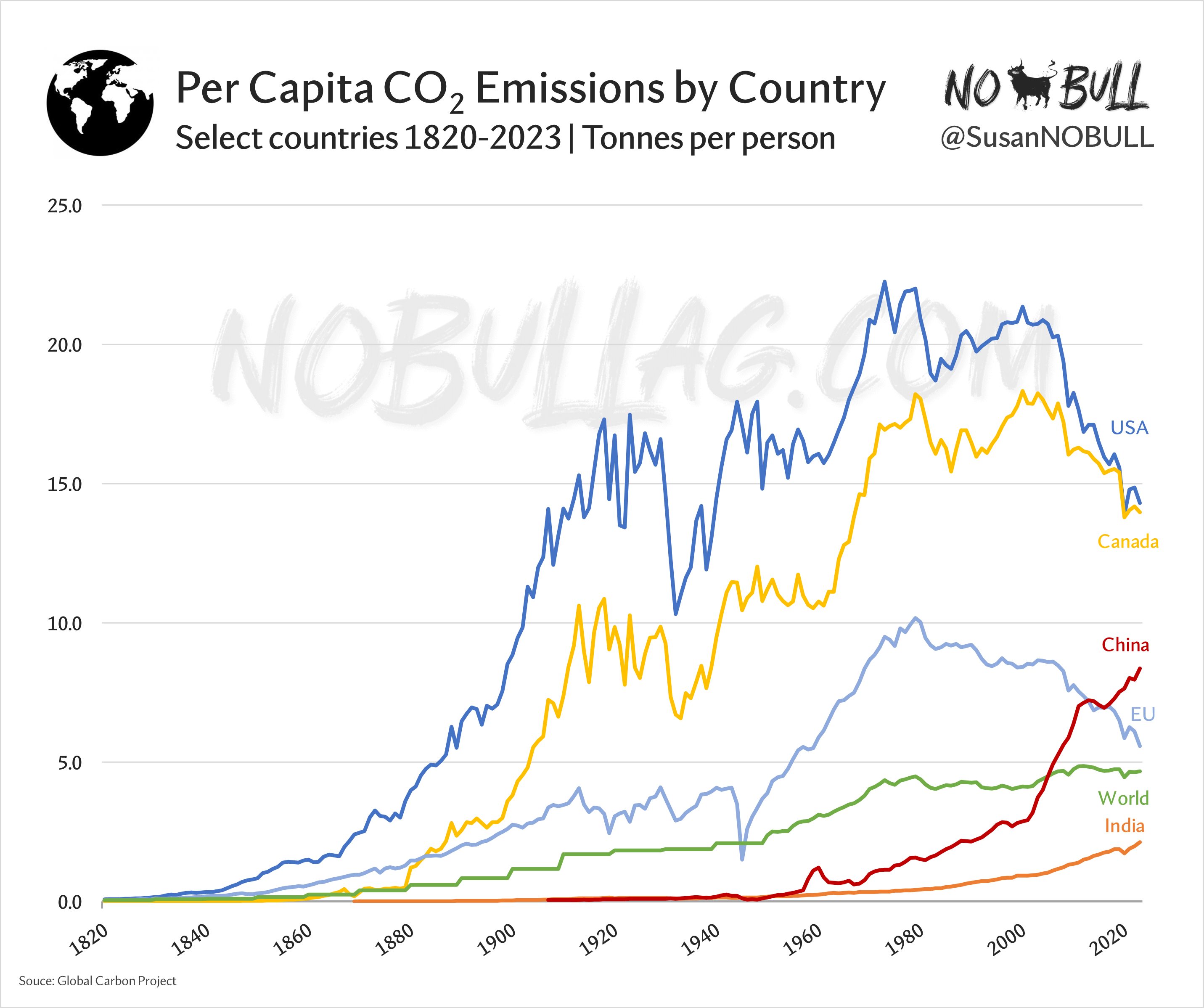 While China has the highest total CO2 emissions globally by a mile, their per-capita emissions pale in comparison to other developed nations: