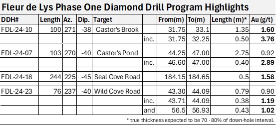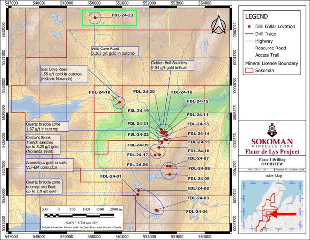 Timothy Froude, P. Geo., President and CEO of Sokoman Minerals, states, "Our inaugural drill program was conducted on an 8 km2 section of the 329 km2 Fleur de Lys Project. It returned many promising results, with 50% of the drill holes intersecting gold-bearing structures. The final and most northerly hole (FDL-24-23) intersected five separate gold-bearing veins, which indicates a new direction for further exploration.