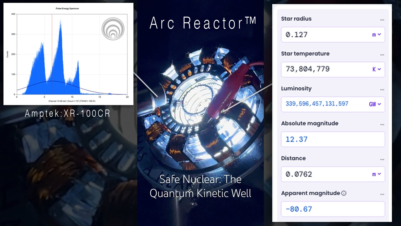 QKC's sustained nuclear fusion is similar to active galactic nucleus (AGN) such as all cosmic blackbody radiators (1 keV - 37.5 keV), this form of E-PT® energy is real, quantifiable, and measurable with state-of-the-art industry detectors (XR-110CR & PulseTor SDD). Quantum Kinetics consistently replicated the nuclear phenomenon over four years of painstaking research using the water-based Quantum Kinetic Fusor™ (QKF™) device, which is a derivative design of the Arc Reactor™. As stated above, the QKF™ results have been peer-reviewed in a npjNature journal and heralded by the reviewers as "a much-needed invention around the world."