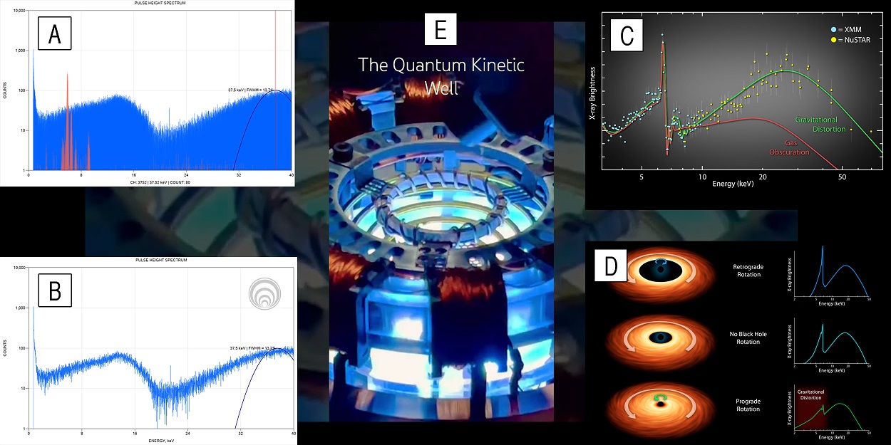 Figure 2: The Arc Reactor™ utilizing the QKW® technology operating at 1.9 watts producing >180 million degrees Celsius nuclear fusion temperatures (X-rays between 1 keV to 37.5 keV) similar to nascent luminous cosmic blackbody radiators. a.) PulseTor SDD X-ray detector spectrum of the Arc Reactor™ after 60-seconds. RED emissions are of radioactive Fe-55 calibration samples. b.) PulseTor SDD X-ray spectrum of the Arc Reactor™ with ‘line representation' of emissions. c.) NASA's NuSTAR X-ray telescope spectrum emission of NGC-1365 showing gravitational distortion effects of X-rays. d.) NASA's X-ray radiation emissions active galactic nucleus (AGN). 'Prograde Rotation' behavior is in likeness to the Arc Reactor™ emissions. e.) The fully functional and operational Arc Reactor™ blackbody radiator cold fusion device.
