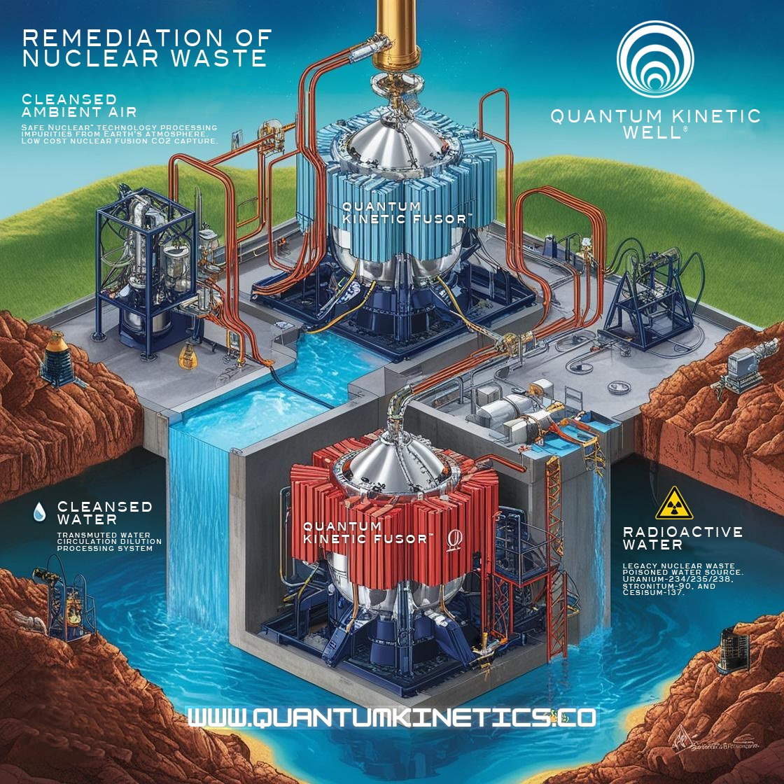 Figure 4: AI generated image rendition of a future Quantum Kinetics Corporation's nuclear remediation station. The Quantum Kinetic Fusor™ transmutation device triggers UNF (Used Nuclear Fuel) remediation with head-spinning speed. Effectively speeding up the 700-million years half-life of Uranium-235, and slashing it down to a mere 24-hrs. This Safe Nuclear™ system can process radioactive air, slurry mixes, and poisoned (tritiated) water.