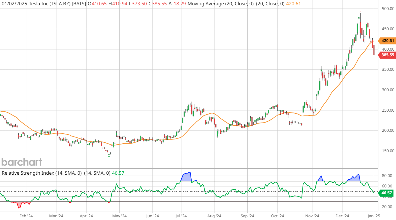 TSLA stock is down more than 4% to start the first session of 2025, and on pace for a second consecutive daily close below its 20-day moving average. The volatile mega-cap stock is now down more than 20% from its Dec. 18 high around $488. TSLA, which is trading down for the fifth session in a row, could also close below $400 for the first time since Dec. 9.