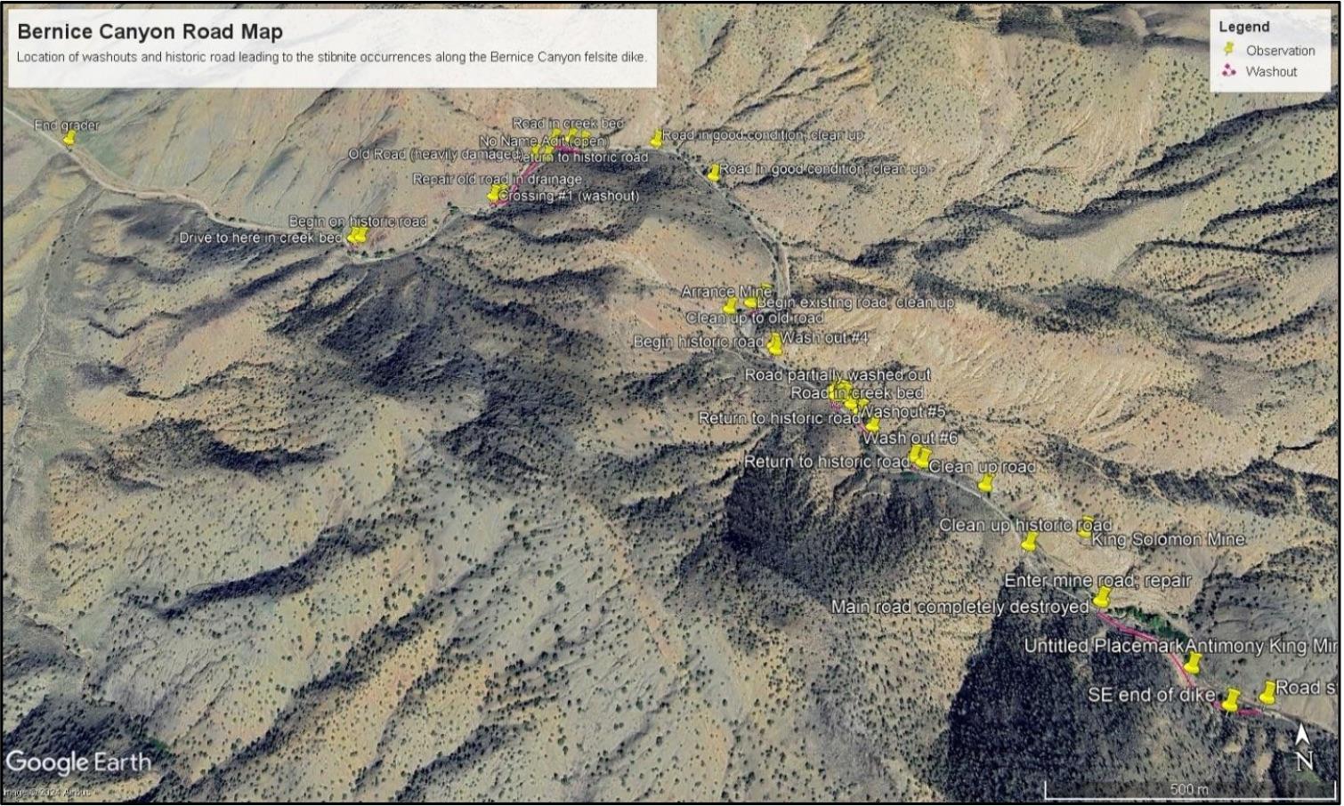 Xtra Energy anticipates that this process will encompass the restoration of the historic road leading to the Antimony King mine (See Figure 1.). The purpose of this recovery is to gain access to several sites within Bernice Canyon to drill and test the mineralized felsite dike near the Arrance, King Solomon, and Antimony King mines (See Figure 2.). A Reverse Circulation (RC) drilling program is likely to best address the need for quality samples along the felsite dike complex's strike.
