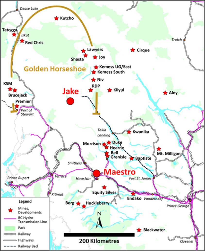 The 100% owned Maestro Project, located in central British Columbia, lies adjacent to Highway 16, 15 km north of Houston and 50 km south of Smithers, providing year-round road access to the Project and nearby infrastructure including, rail, hydroelectricity, and natural gas.