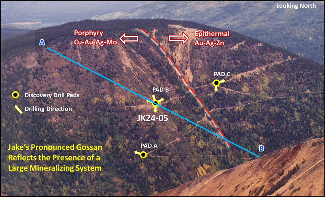 Mineralization at Jake is situated within a prominent rusty coloured gossan measuring 3.5 km long by 1.5 km wide. Within the gossan is north-trending dyke swarms that intrude into sedimentary rocks. The combination of extensive historical and recent exploration work has outlined a very expansive altered area at Jake hosting epithermal and porphyry-style sulphide disseminations and veinlets containing Cu-Au-Ag-Zn-Mo and Re. To delineate deposit targets within this large Jake mineral system for the recent drilling program, a series of modern surface exploration programs were completed in the period 2018-2023. This exploration work included detailed airborne magnetic surveying, geological mapping, geochemical sampling/modelling and Induced Polarization ("IP") surveying. These exploration surveys were designed to build on very compelling historical data on the Property developed by legendary porphyry copper explorers, including Kennco, Canadian Superior, Cities Service, Placer Development and Teck Corp. Taken together this comprehensive Jake Project technical database defined a significant-scale porphyry copper-gold deposit target and associated epithermal precious metal deposit targets which Quartz has capitalized on.
