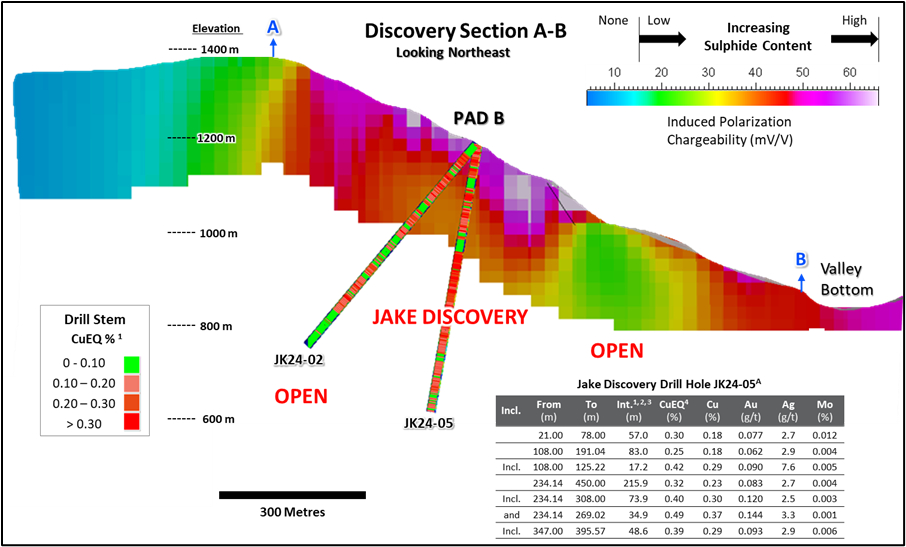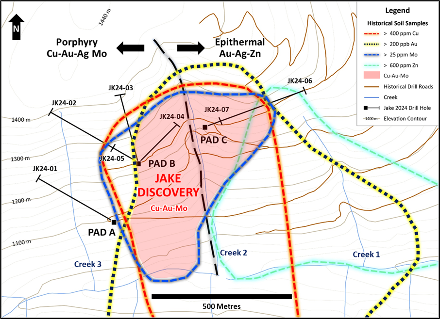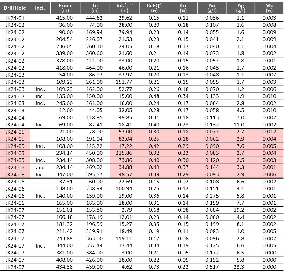 The discovery of a new copper-gold porphyry system at Jake, was highlighted by drill hole JK24-05, with combined announced Cu intercepts in the hole totaling 355 meters (see Table 1).