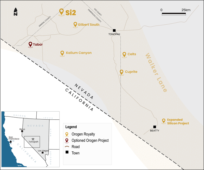 VANCOUVER, BC / ACCESS Newswire / January 16, 2025 / Orogen Royalties Inc. (TSXV:OGN.VN)(OTCQX:OGNRF) ("Orogen" or the "Company") is pleased to announce that the Company has signed a purchase and sale agreement (the "Agreement") with K2 Gold Corporation ("K2") (TSXV:KTO.VN) whereby K2 has acquired the Si2 gold project ("Si2" or the "Project"), located in Nevada, USA. The Agreement replaces the option agreement ("Option Agreement") previously signed between Orogen and K2 on January 19, 2022.1