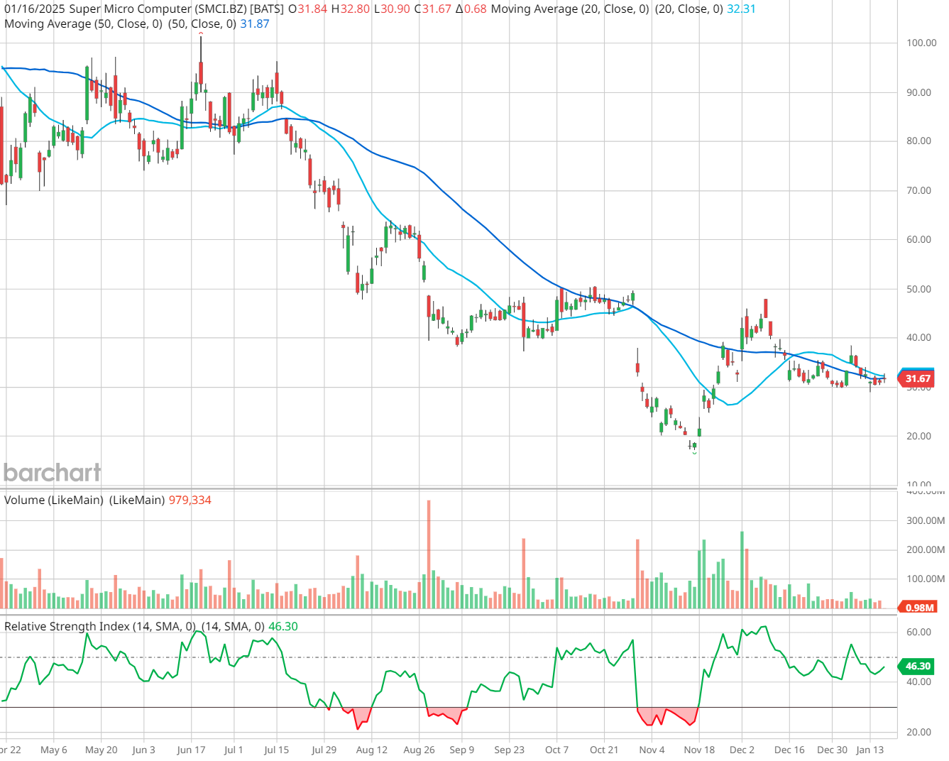SMCI is up more than 2% today, with many AI-related names rising after a well-received earnings report from Taiwan Semiconductor (TSM). However, the shares are facing overhead pressure at their 20-day and 50-day moving averages, which are currently converging around the $32 level.