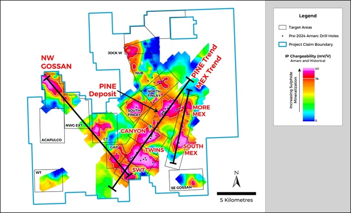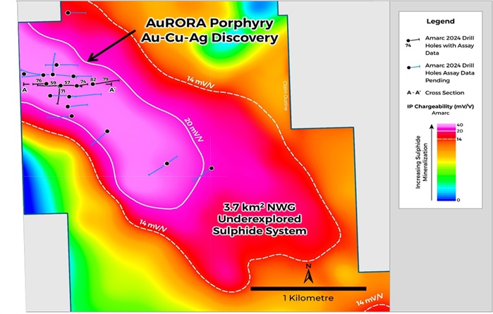 The AuRORA Deposit Discovery is located within the expansive Northwest Gossan ("NWG") Target area located at the northwest end of a possible 15 km mineralized trend that extends southeast toward the GAP and SWT Targets (see Figure 1). The NWG Target is outlined by a 3.7 km 2 Induced Polarization ("IP") anomaly (>14mV/V) (see Figure 3) with coincident Cu, Au, Mo and Ag anomalies outlined in soils and rocks (see Amarc releases May 2 and July 11, 2024). The 2024 initial drill testing of the NWG Target area focused primarily on an internal zone of higher (>20 mV/V) IP chargeability some 1,500 m long and 500 m wide. Much of the NWG Target area remains unexplored.