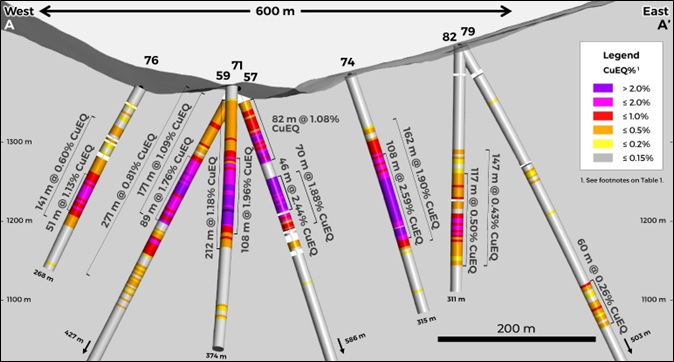 Figure 5: AuRORA Deposit Discovery: Drilling Outlines Open-Ended, Near Surface, Continuous, High Grade Cu-Au-Ag Mineralization (Section 7800N)