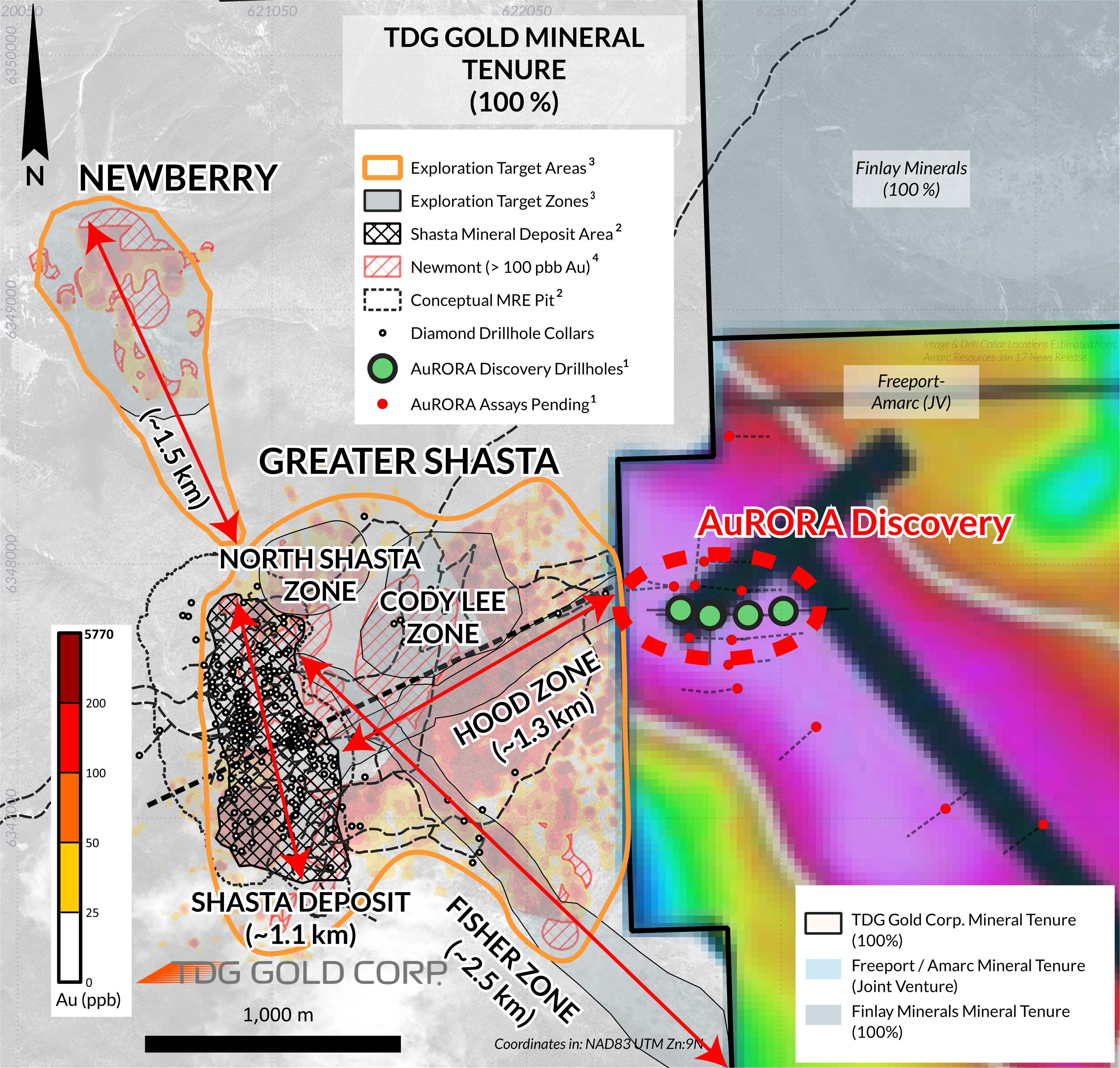 Freeport-Amarc's AuRORA gold-rich plus copper discovery sits directly on trend with TDG's Greater Shasta project which includes the former producing, gold-silver Shasta mine and mineral deposit (Figure 1). On January 08, 2025, TDG provided an updated Mineral Resource Estimate2 ("MRE") for Shasta showing improved grades. TDG has identified potential extensions3 to Shasta that are contiguous with the boundary of AuRORA1. These trends3 have never had IP geophysics or modern drill testing.