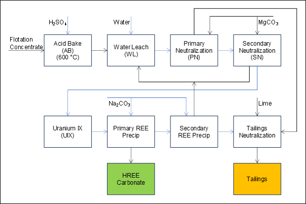 Current test work has shown that a significantly simplified flowsheet consisting of two stage (primary and secondary) impurity removal/neutralization, followed by Uranium IX and two stages (primary and secondary) of REE carbonate precipitation is able to produce high grade HREE carbonate.