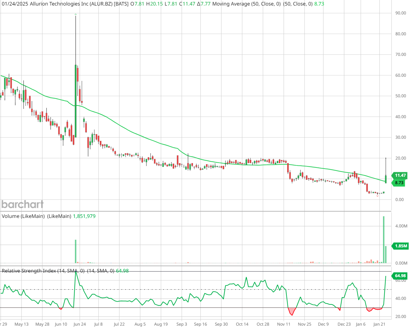Separately, ALUR said this morning they have entered a securities purchase agreement to raise approximately $7.4 million for working capital and general corporate purposes. This is part of their strategy to improve financial stability amid cash burn challenges. The offering is priced at $6.00 per share, well below today’s early high of $16.81.