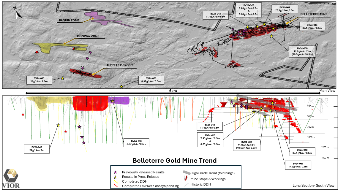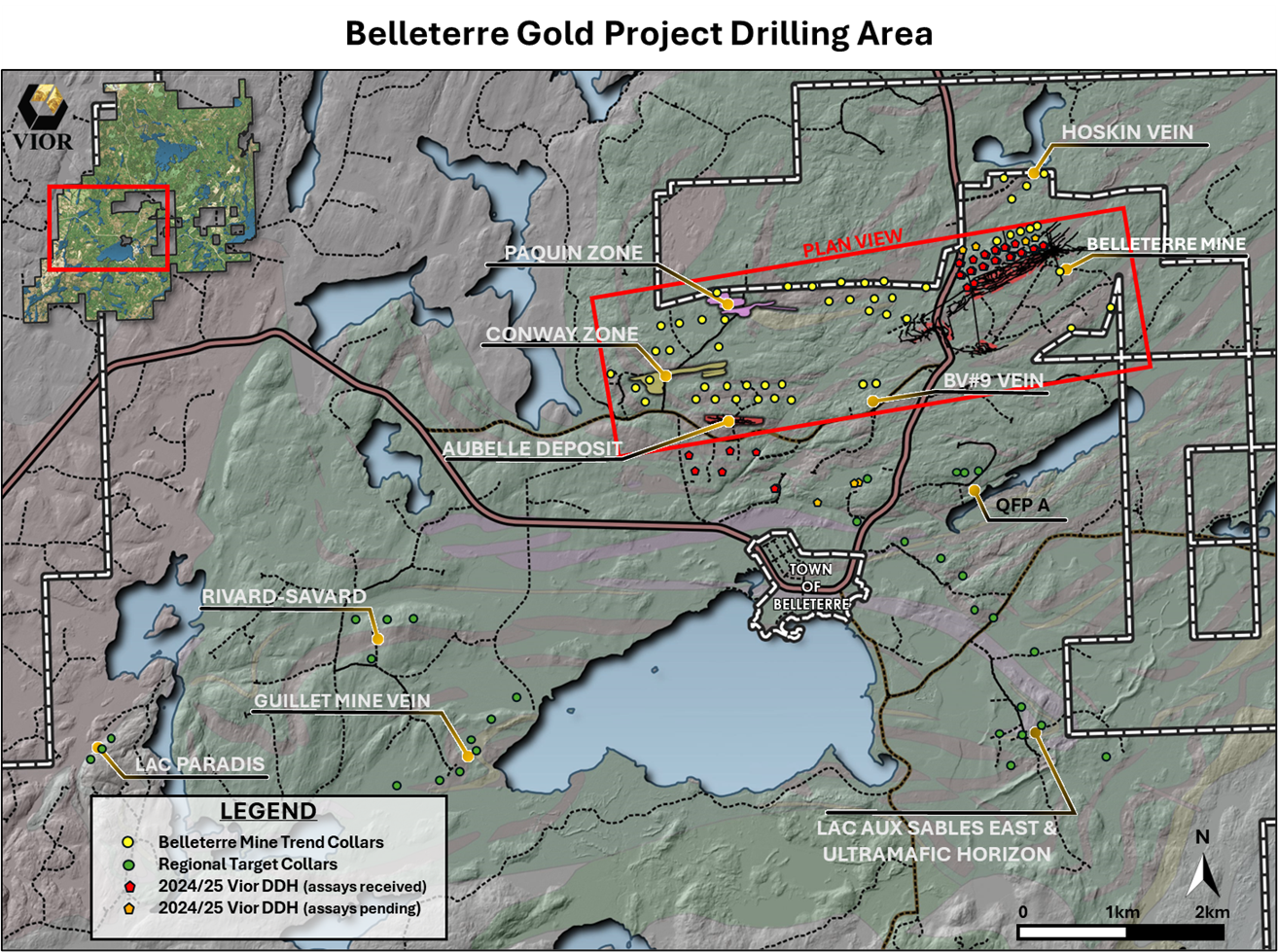 MONTREAL, QC / ACCESS Newswire / January 27, 2025 / VIOR INC. ("Vior" or the "Corporation") (TSXV:VIO.VN)(OTC-BB:VIORF)(FRA:VL51) is pleased to provide new analytical results from its ongoing +60,000-metre drill program at its Belleterre Gold Project in Quebec's Belleterre Greenstone Belt. The drilling has successfully confirmed the continuity at depth of Vein #12 below the past producing Belleterre Mine while also highlighting a new target area located south of the Belleterre Vein #12.