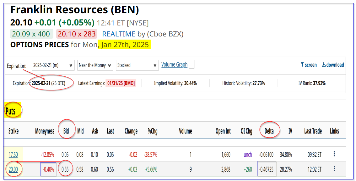 This might work better for existing BEN shareholders as the delta ratio is only -11.7%. That means there is less than a 12% chance of BEN stock falling to this point in the next 53 days to expiry.