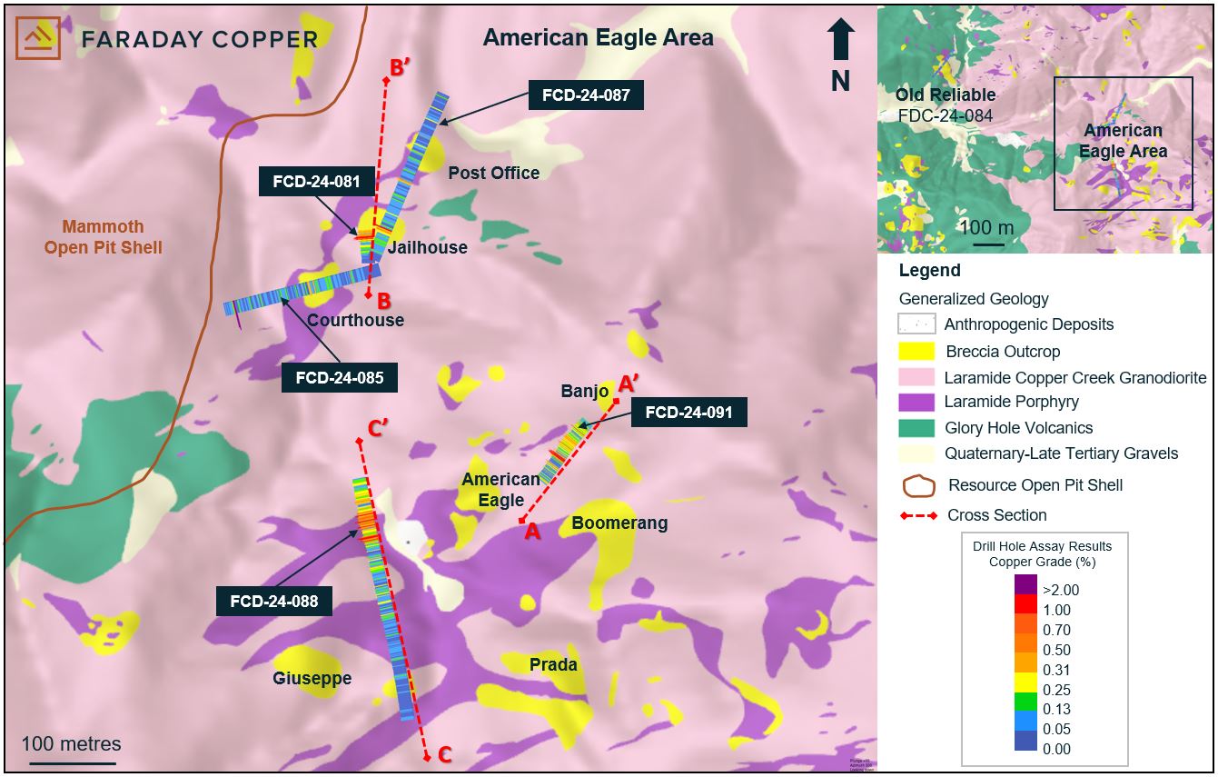 VANCOUVER, BC / ACCESS Newswire / January 30, 2025 / Faraday Copper Corp. ("Faraday" or the "Company") (TSX:FDY.TO)(OTCQX:CPPKF) is pleased to announce the results of six drill holes from its ongoing Phase III drill program at the Copper Creek Project, located in Arizona ("Copper Creek"). Five holes were drilled in the American Eagle area and one at Old Reliable.