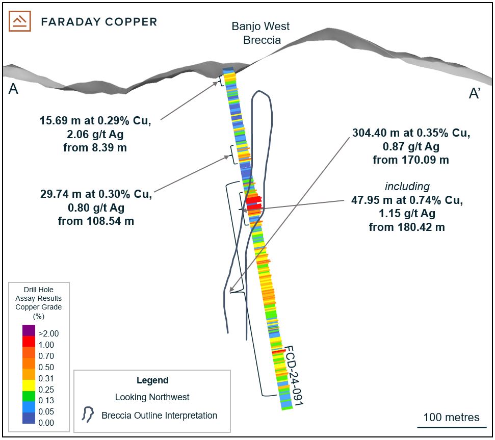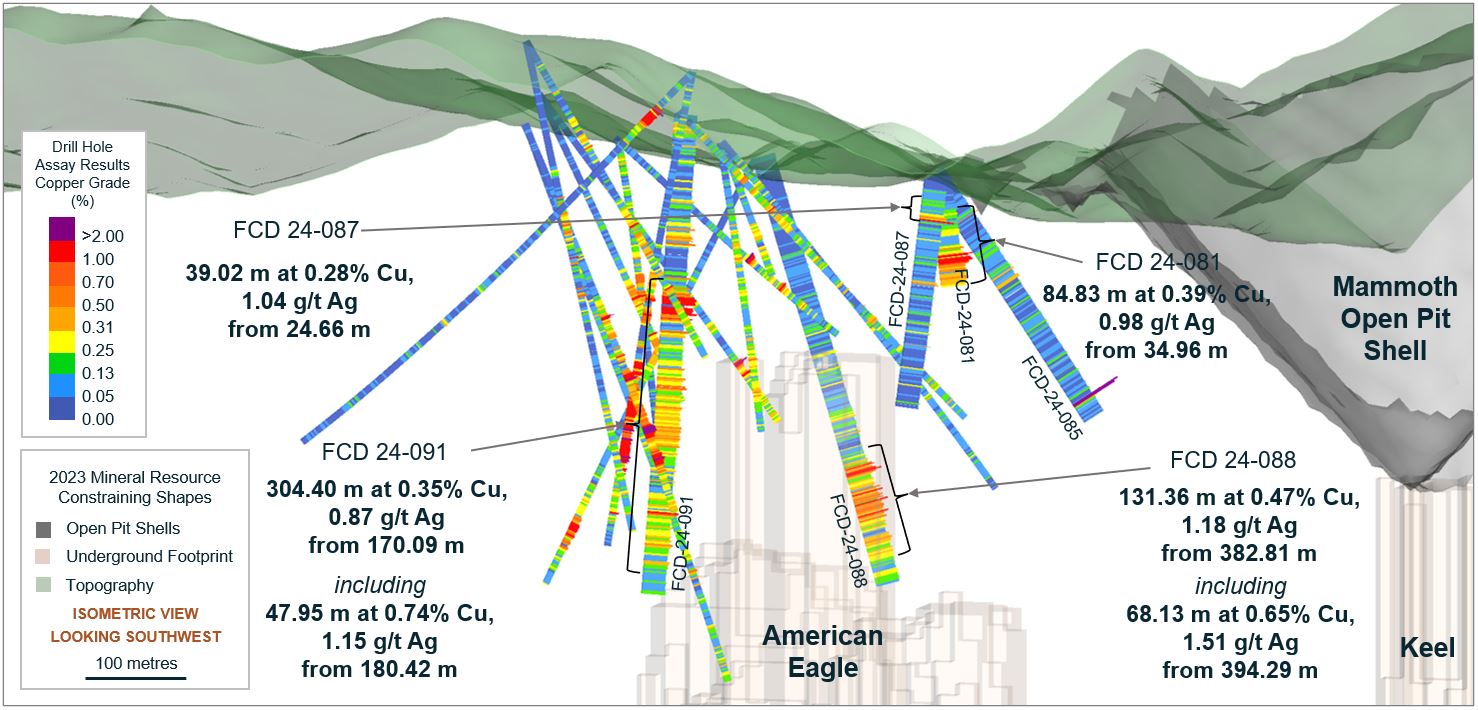 In the American Eagle area, west of the Banjo breccia, drill hole FCD-24-091 intersected 304.40 metres ("m") at 0.35% copper and 0.87 grams per tonne ("g/t") silver from 170.09 m, including 47.95 m at 0.74% copper and 1.15 g/t silver from 180.42 m.