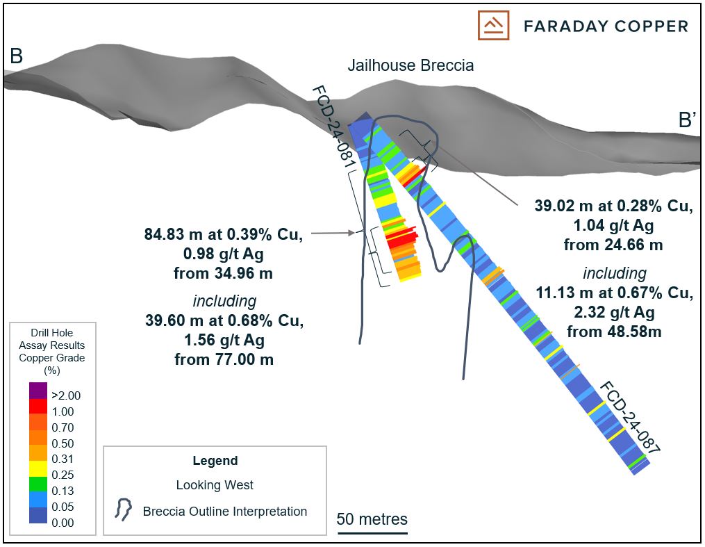 Note: The field of view represents an approximately 700-metre-thick slice. The open pit shell and underground footprint are based on constraints used in the MRE as presented in the Technical Report available on the Company's website at www.faradaycopper.com and on the Company's SEDAR+ profile at www.sedarplus.ca. For drill holes not reported herein, refer to news releases dated June 25, 2024, July 25, 2024, August 21, 2024, September 24, 2024, and October 17, 2024, November 19, 2024, and January 8, 2025.