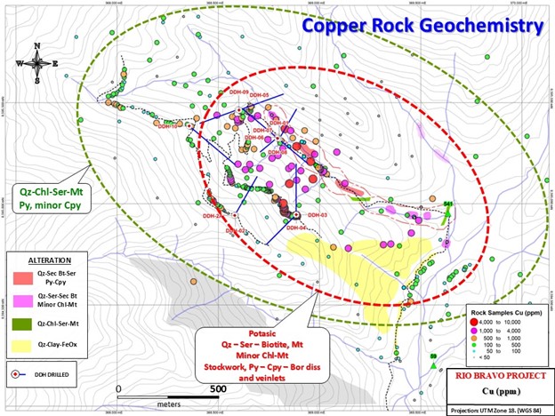 Historical drilling, geochemical and geophysical data recently obtained from a major mining company that previously controlled the Rio Bravo project confirms intersections of significant porphyry copper and molybdenum mineralization associated with a largely untested target.