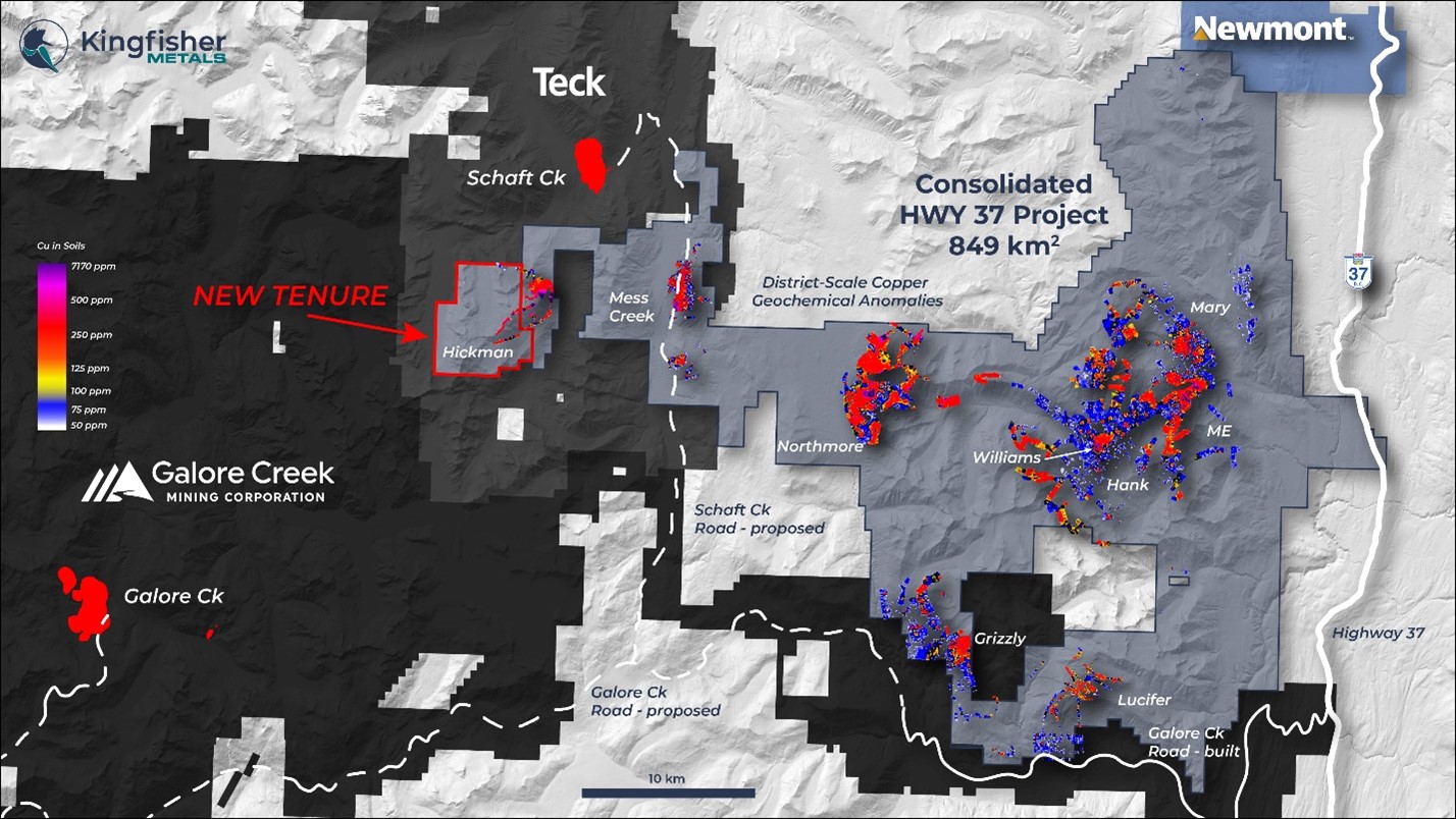 The Hickman Project is comprised of two claims totalling 3,008 hectares and is located immediately west and contiguous with Kingfisher's HWY 37 Project in Northwest British Columbia within the Golden Triangle.