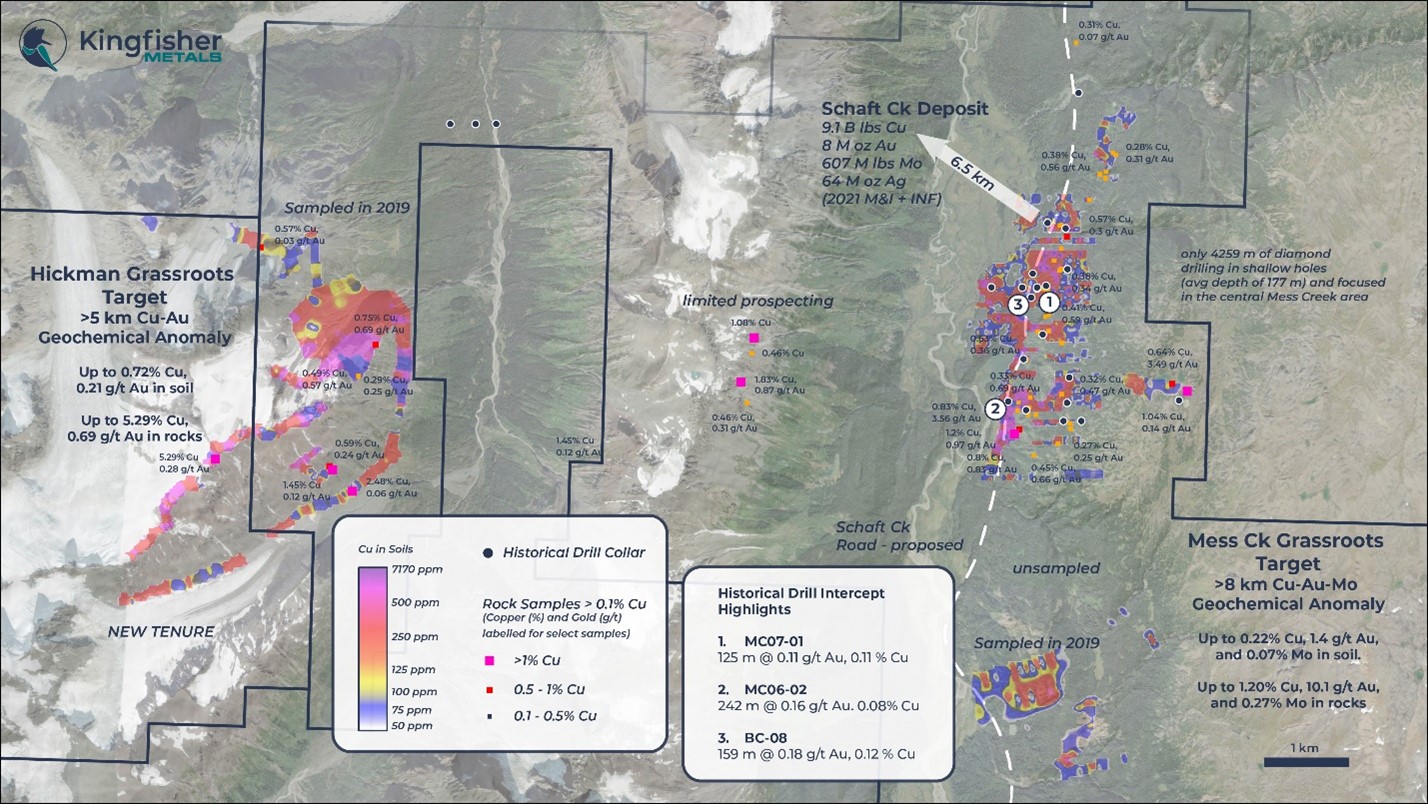 The Hickman Project is highly prospective for Cu-Au porphyry systems and hosts an undrilled copper-gold geochemical anomaly at the Hickman Target that includes recent (2019) rock sampling results of up to 5.3% Cu and 0.28 g/t Au. This accretive acquisition secures the full extent of the open-ended Hickman Target that spans 5 km and is located 6 km away from the Schaft Creek deposit. The Transaction will bring the consolidated HWY 37 Project to 849 km2.