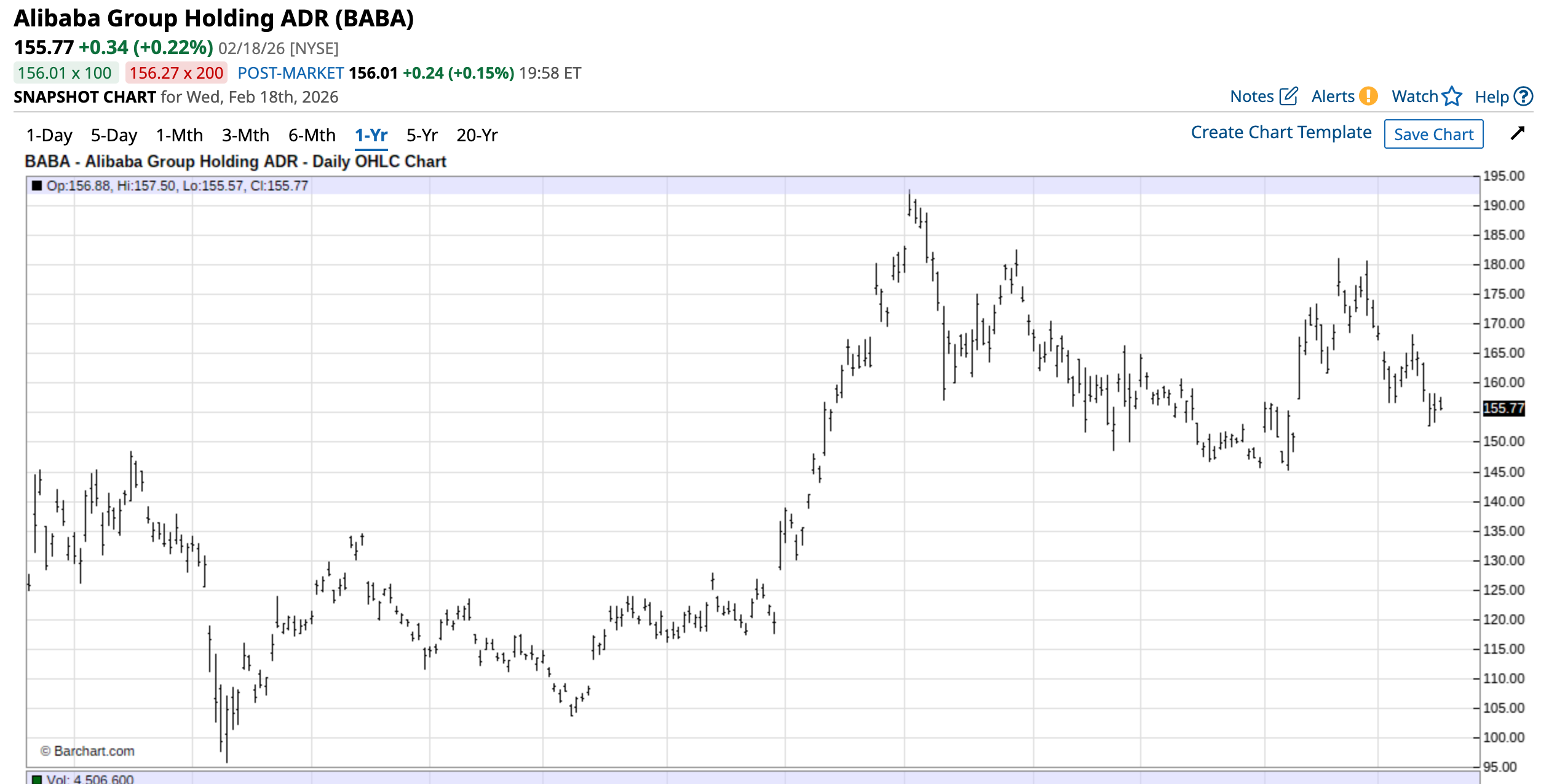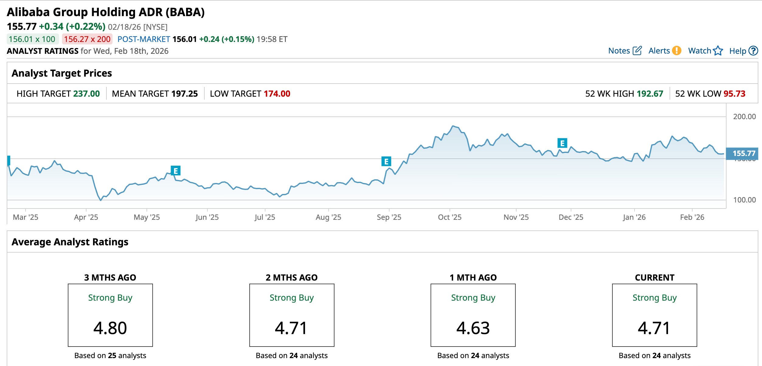 Over the past 52 weeks, Alibaba’s stock has gained 22.75%, while it has been up 6.27% year-to-date (YTD). The company’s shares had reached a 52-week high of $192.67 in October 2025, but are down 23.69% from that level.