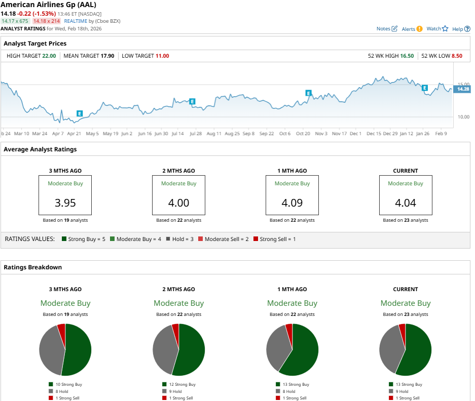 Recent pressure on American Airlines has presented investors with an opportunity, which is recognized by analysts who have a consensus “Moderate Buy” rating on AAL stock with a mean price target of $17.90, reflecting an upside potential of 26% from the market price.