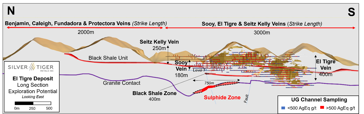 The El Tigre Project underground drilling campaign is targeting the Veins, the Sulfide Zone and the Shale Zone with the first three holes targeting the Sulfide Zone. These high-grade zones form a crucial early component of the UG PEA as enumerated below (see Figure 3 for Zone numbering):