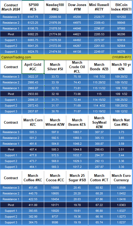 Movers and Shakers by John Thorpe, Senior Broker : Tomorrow (CPI) before the open, CSCO After the close Fed Powell’s testimony in the Senate had the market moving today. Gold started to sell off well before the testimony began, down $25.00 then as Powell spoke @ 10 EST, the market rallied from that point in somewhat of a slough to unchanged, but struggled to breakout and looks to close a shade off yesterday, down 8 bucks. Holding rates for quite some time longer didn’t add fuel to the current rally. Powell testifies tomorrow in the House, same time. The S&P 500 rallied from Powell’s opening remarks 20 points, then fell back at the 2-hour mark to where it began:6070.00 only to rally NEARLY 30 POINTS FROM THERE AFTER THE CONCLUSION. However, they look to close unchanged at the time of this writing. 6088.00.  This was a very tradeable day. After scanning several markets Energies, Bonds, Dollar index. They all finished the day right about where they were prior to Powell’s opening remarks accept for the US Dollar, which closed lower as Gold retained some of it’s luster.  WASDE was released this morning as well, whose results weighed on domestic Ag row crop prices, Beans down 6 cents, Corn down 7.5-6.25 for old crop, new crop Dec down a penny (will grains in the future be quoted in pennies with the dissolution of the one cent coin?) Wheat down between 2.5 to 7 cents across the board and protein spectrum. Cotton bucked the trend and had a strong rally after the numbers, up .74 basis the May contract. As for the softs, Coffee lost some caffeine today, down from it’s all-time highs, 15 + cents per pound @ 413.45 Market volatility is here to stay for the foreseeable future Choose your opportunities wisely. Tomorrow: CPI (Consumer Price Index) before the open, Fed Powell Testimony in the House of Representatives 9 am CST, Fed Bostic 11:00 am CST . Earnings: Cisco After the close, CME Group, before the open  |