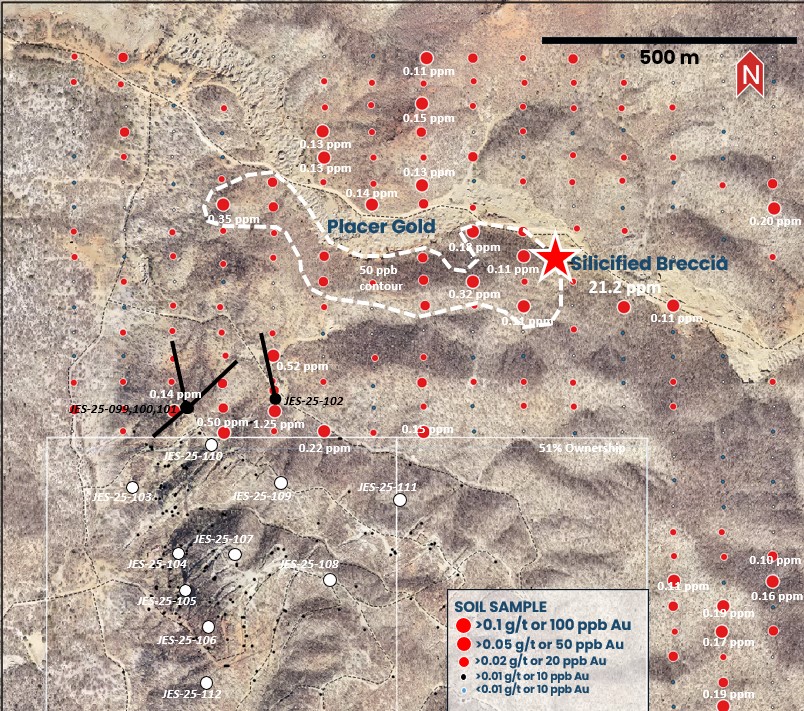 Silicified Hematite-Breccia Identified in Outcrop within Soil Anomaly Adjacent to Placer Gold