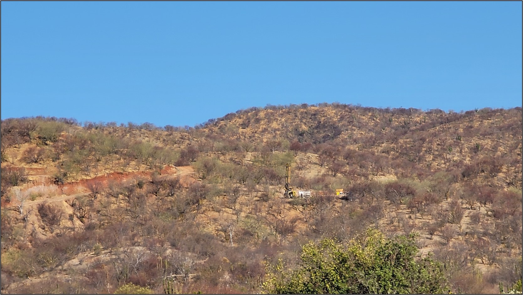Photo 2. Core drill rig setting up on the south end of the Main Zone Trend targeting the depth projection of the red oxidized material exposed along a road cut left of center on the image.
