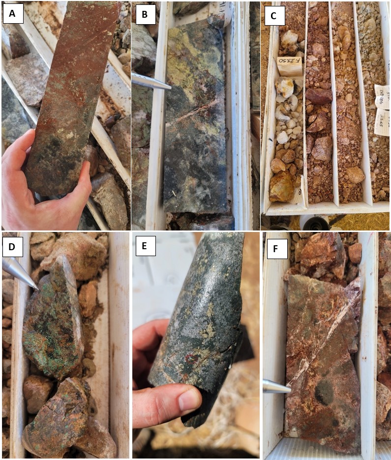 Plate 1. Different alteration and lithology styles related to mineralization at Pilar as seen in the recent core program. A. Intense hematite flooding of andesite host rock with later silicification, JES-25-104, 88 m depth. B. Silicified breccia with intense silicification, moderate epidote-chlorite alteration and late hematite vein stockwork, JES-25-104, 90m depth. C. Wide intensely oxidized fault zone with white quartz veining, JES-25-103, 23m depth. D. Malachite with hematite in highly fractured and oxidized host rock, JES-25-103, 27m depth. E. Silicified breccia with intense chlorite and pyrite and minor chalcopyrite, JES-25-107, 55m depth. F. Intense fractured silicified breccia with intense hematite and late calcite veins, JES-25-105, 85m depth. The Company cautions these are visual indications, assay results are pending to verify the grade of mineralization and width.