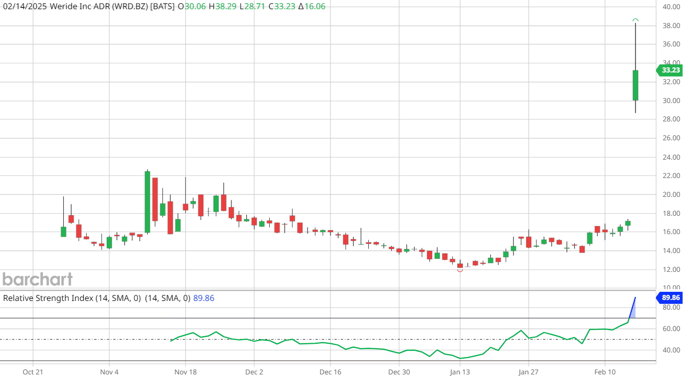 Shares of WRD, which debuted on the Nasdaq last October, are set to open at new all-time highs north of $30. Today’s rally looks poised to drive WeRide stock well into short-term overbought territory.