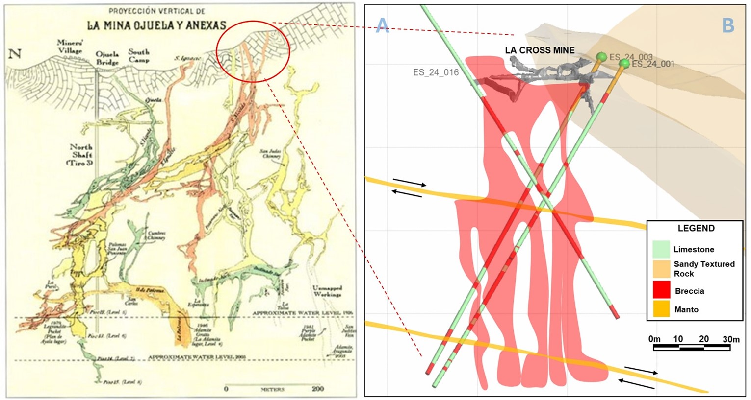 Figure 3 - Geometry of the Ojuela Mine mineralized mantos and chimneys compared to the La Cross breccia bodies intercepted at El Soldado in drill holes ES-24-01, ES-24-03 and ES-24-16