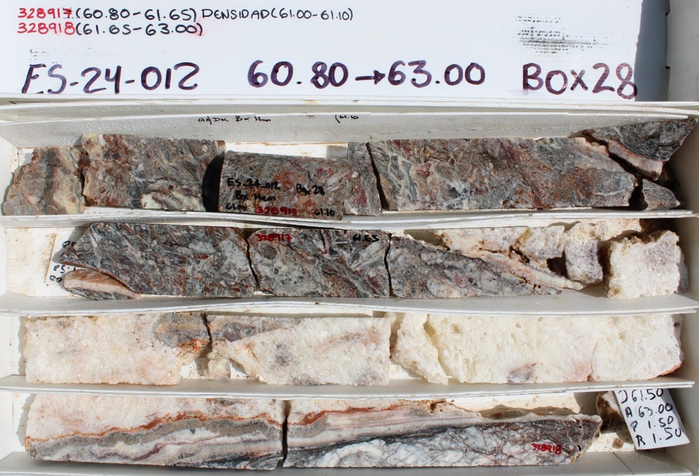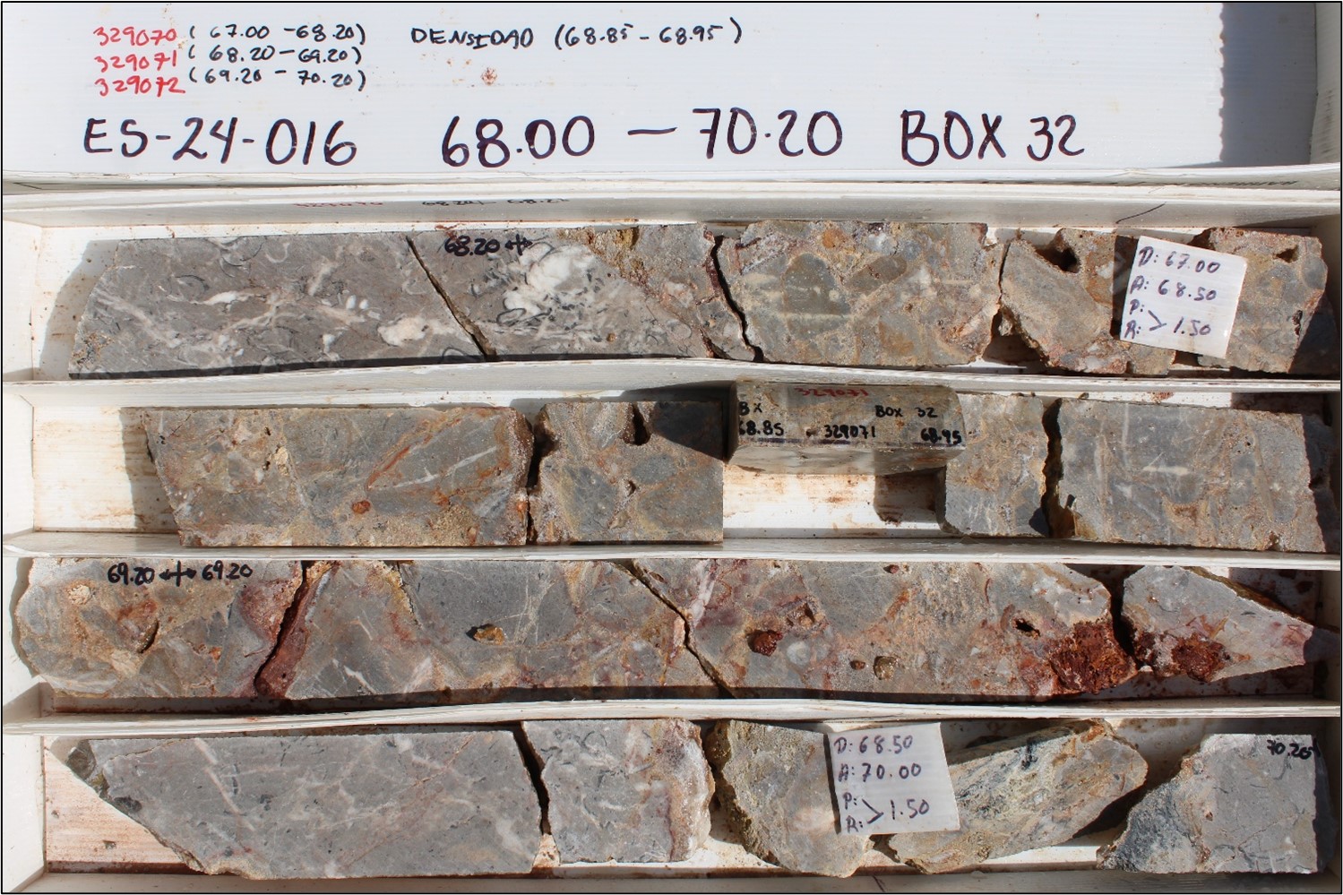ES-24-016 cut an extensive breccia body underneath the historic La Cross artisanal mine (Figure 3). Samples were taken across areas with abundant veining of white calcite and crackle breccias with carbonate matrix and hematite-rich fractures (Figure 4). A lead value of 1.91% over 1 m was encountered in hole ES-24-16 (69.2-70.2m). Notable assays can be viewed below in Table 1.