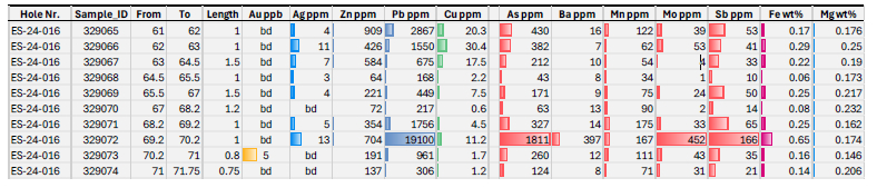 ES-24-007 and ES-24-005 were designed to intercept the continuation of the Hedionda manto body dipping to the NE. A manto feature with dolomitization was intercepted in both holes at the projected intercept, however anomalous Zn values were found in hole ES-24-005 at 47m depth. A different mineralized breccia feature was intercepted in hole ES-25-005 with values of 4.85% Zn and 0.47% Pb over 1m (15.75-16.75m).