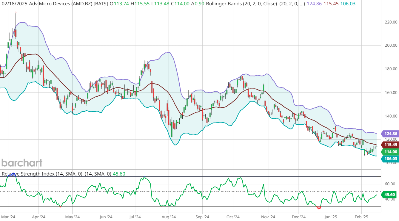 AMD is slightly higher this morning, chipping away at the 13% correction from its Jan. 7 year-to-date high. The shares are bouncing back from a recent break below their lower Bollinger Band, and are now sitting just below their 20-day moving average.