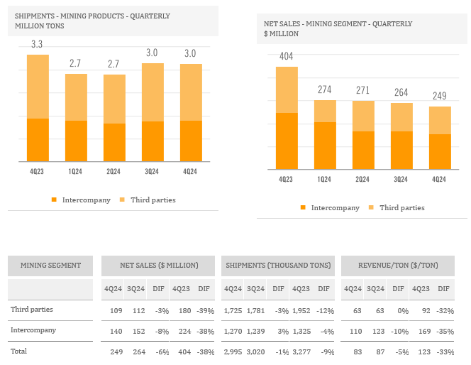 In the fourth quarter of 2024, the Mining Segment's net sales decreased sequentially by 6%. On a sequential basis, the Mining Segment's shipments remained stable. However, on a year-over-year basis, shipments decreased by 9% in the fourth quarter, primarily due to lower production levels in our Mexican and Brazilian operations.