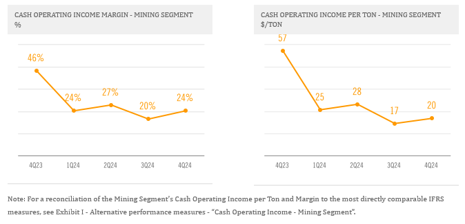 The Mining Segment's Cash Operating Income per Ton and Margin increased sequentially in the fourth quarter of 2024 due to lower operating costs, partially offset by a decrease in realized iron ore prices. The reduction in operating costs was partly attributed to a lower-priced mix of sales.