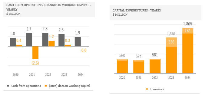 In 2024, dividends paid to the company's shareholders amounted to $609 million. Capital expenditures for the year reached $1.9 billion, showcasing Ternium's progress in expanding its industrial center in Pesquería, Mexico, and the construction of a new wind farm in Argentina, which was inaugurated by the end of the year. Despite these significant cash disbursements, the company's net cash position at the end of 2024 was $1.6 billion. Strong operating cash flow of $1.9 billion and a $457 million increase in the fair value of financial instruments helped maintain this solid financial position.