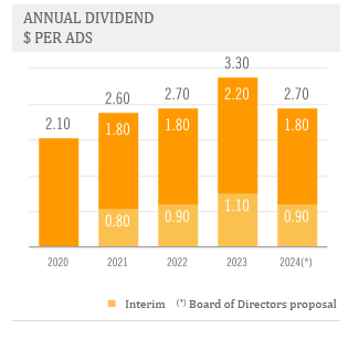 The annual dividend would include the interim dividend of $0.90 per ADS ($0.09 per share), or $177 million, paid in the fourth quarter. If the board of directors' proposal is approved at the shareholders' meeting, a net dividend of $1.80 per ADS ($0.18 per share), or $353 million, will be paid on May 14, 2025, with record date on May 9, 2025.