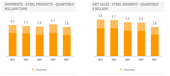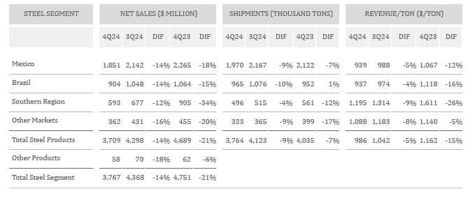 In the fourth quarter of 2024, the Steel Segment's shipments and net sales decreased sequentially by 9% and 14%, respectively. This decline primarily reflects a seasonal activity slowdown, along with a drop in Mexican commercial market demand. Additionally, realized steel prices fell across all of Ternium's markets. On a year-over-year basis, the fourth quarter Steel Segment's shipments and net sales dropped by 7% and 21%, respectively. Sales volumes saw a slight increase in Brazil but declined in other steel markets. Steel prices experienced a year-over-year decrease in all markets.