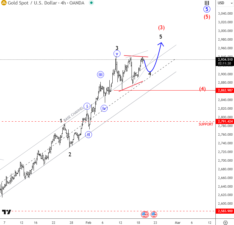 Gold continues trading higher and it's most likely on the way toward 3k area, as we see an unfinished five-wave bullish impulse. In the 4-hour chart we can see a new corrective slowdown that looks like a bullish triangle consolidation within wave 4 which can push the price higher for wave 5 of (3).