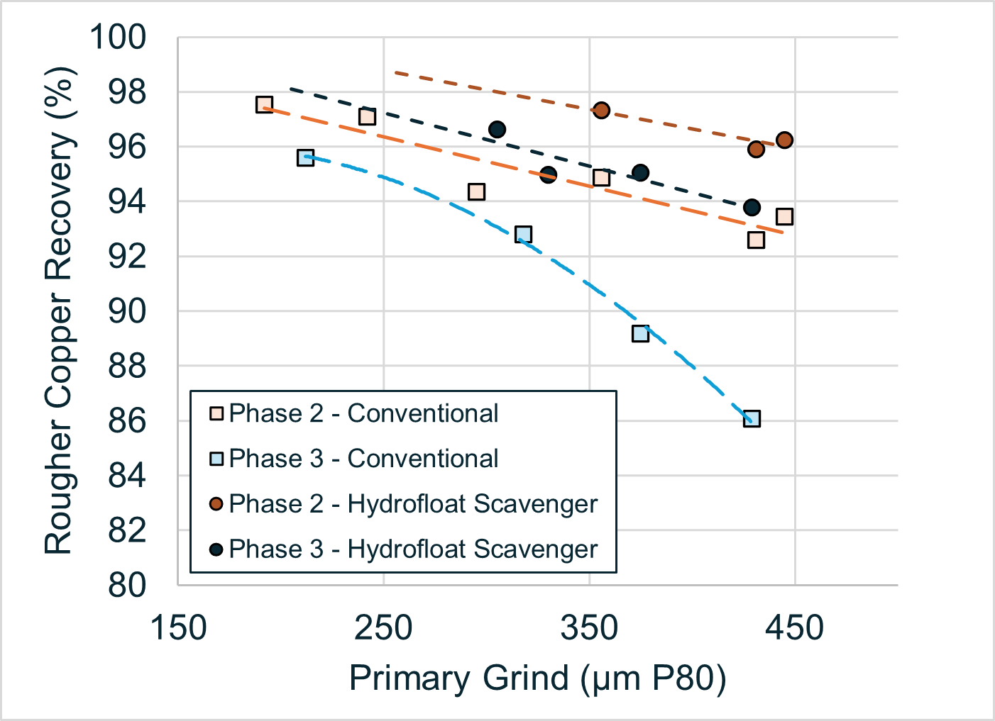 Coarse grind and CPF can be used to maintain high copper recoveries across a full spectrum of feed grades. Applying a 350 micron ("µm") primary grind with CPF scavenging returns comparable copper recovery to a conventional flotation circuit with a 200 µm primary grind3.