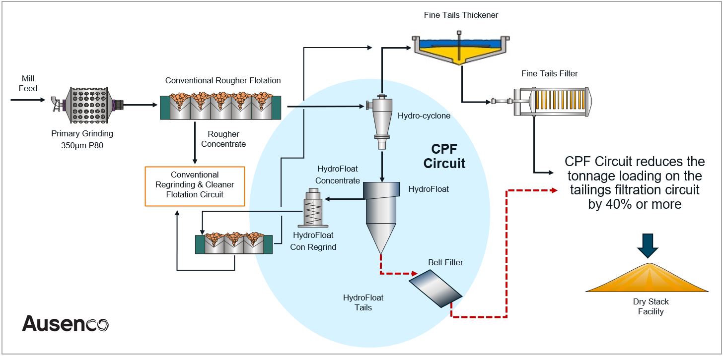 The CPF concentrate requires regrinding prior to returning to the rougher feed or similar conventional flotation stage. A simplified flowsheet incorporating CPF is presented in Figure 3.