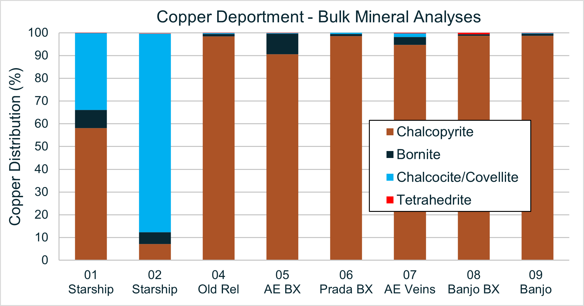 Mineralogical composition assessments were completed on the variability samples by QEMSCAN. The results provide valuable confirmation of core logging interpretation and are consistent with geochemical assay results. The copper deportment data helps to understand metallurgical performance. Copper deportment by mineral is presented in Figure 5 below.