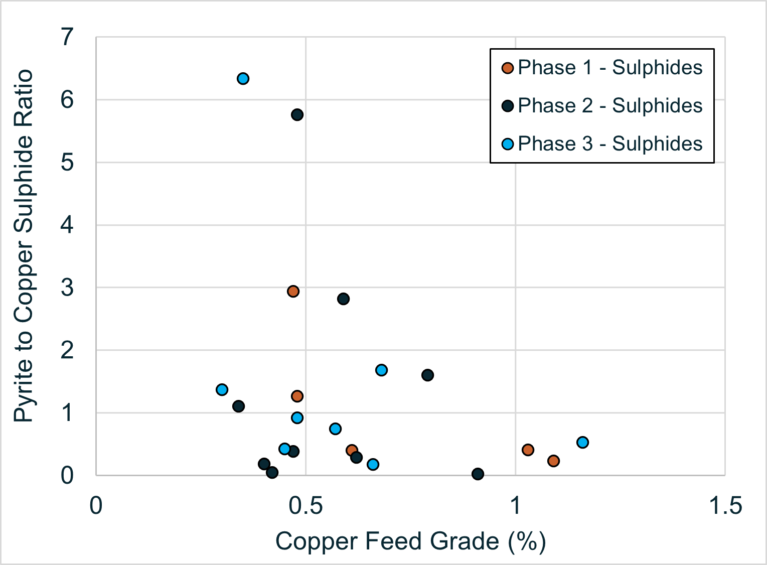 The ratio of pyrite to copper sulphides can be an important processing parameter, as values below three tend to have lower regrinding energy requirements and positive implications on metallurgical performance. The pyrite to copper sulphide ratios of variability samples are displayed in Figure 6 relative to copper feed grade, along with values from sulphide samples tested in previous programs. Generally, the material is low in pyrite content, with 82% of the sulphide samples tested having ratios of pyrite to copper sulphides of less than 2:1.